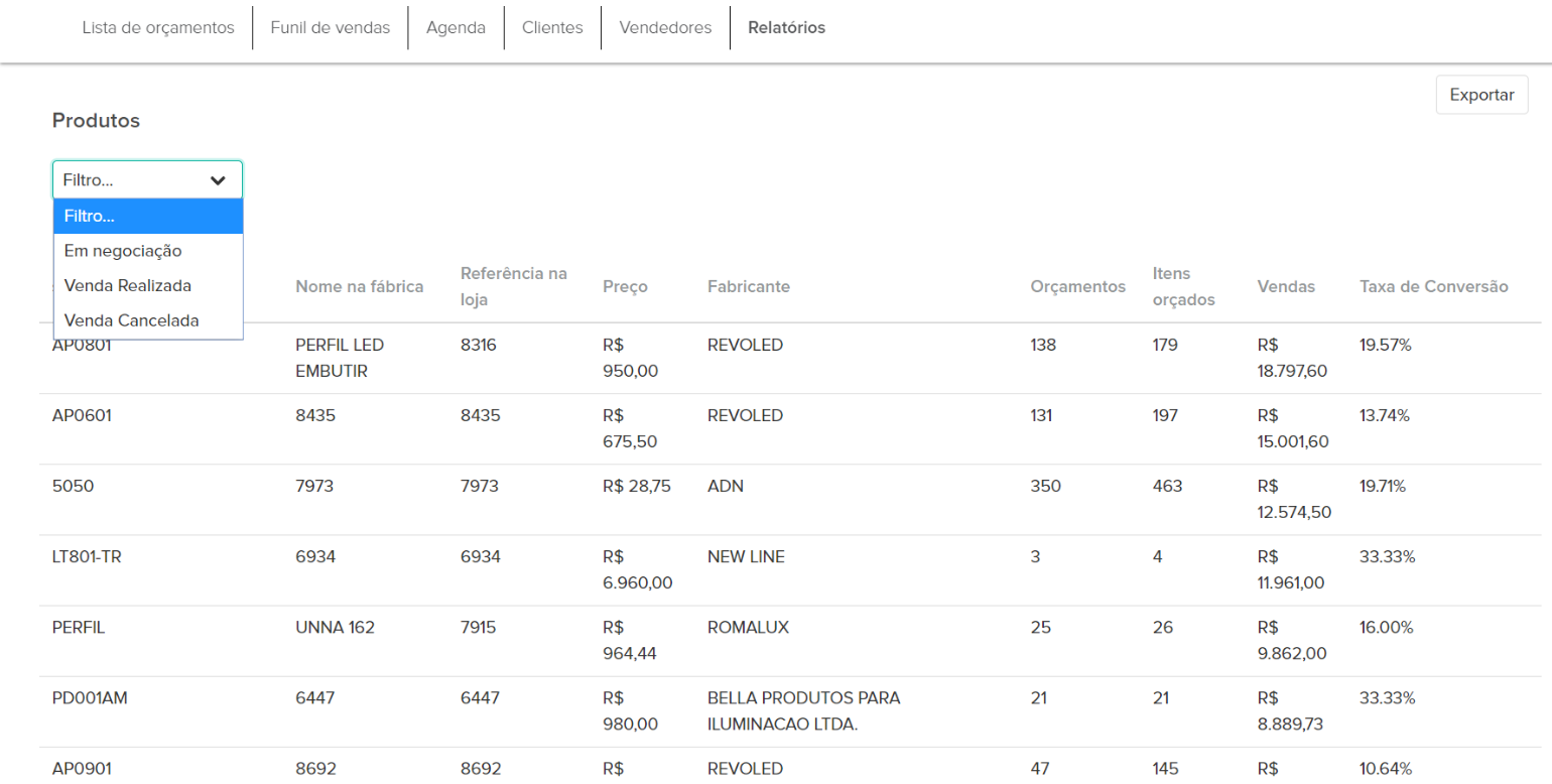 Apresentamos de forma clara a performance de cada fornecedor e produtos em seus orçamentos. Número de vezes que foram orçados, quantidade de vendas, taxa de conversão, número de orçamentos em andamento que cada produto se encontra, são alguns dos dados que fornecemos.