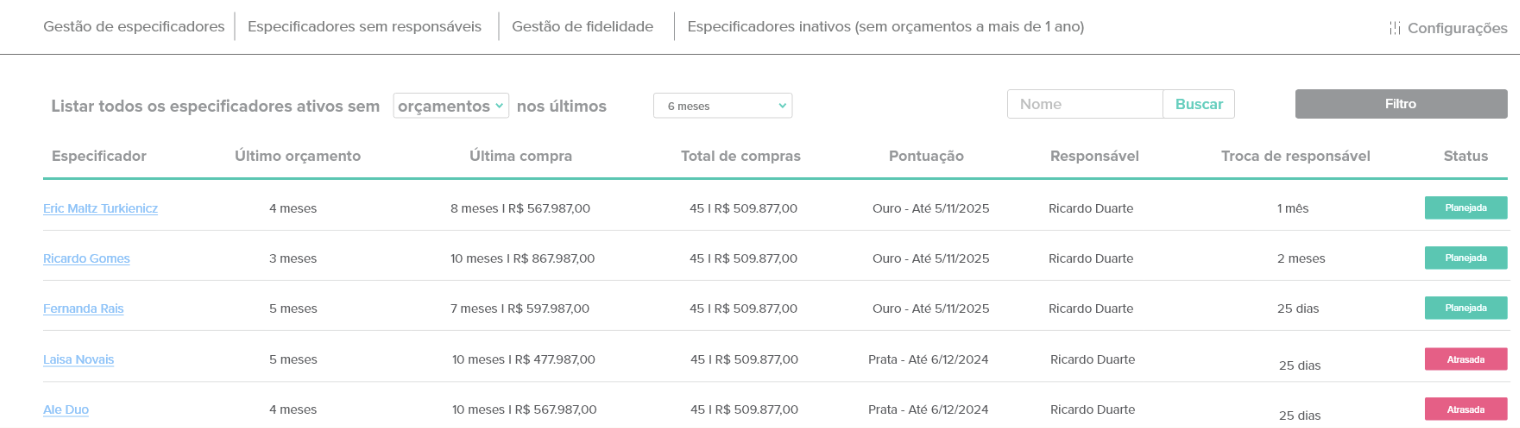 Através de uma página dedicada a cada vendedor, o gestor consegue acompanhar as métricas de orçamentos, previsão de fechamento, vendas, metas mensais, taxa de conversão de vendas, atividades a serem realizadas, atividades atrasadas e o histórico de ações com os clientes. Também é possível acessar de forma rápida toda rede de arquitetos e clientes.