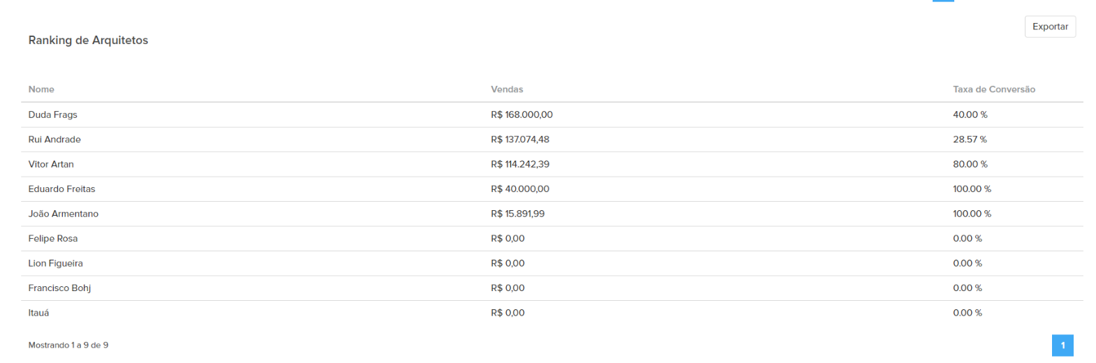 Criamos relatórios com data e lista de arquitetos em relação sua taxa de conversão e o número total de vendas. Com um clique é possível baixar essa planilha em excel com todos os dados do arquiteto para que a loja consiga realizar ações de relacionamento com seus especificadores.
